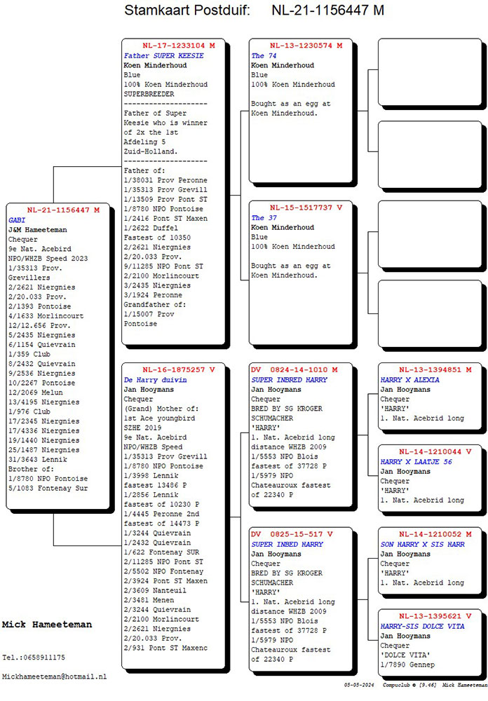 Moeder: โ€˜โ€™DE HARRY DUIVINโ€™โ€™, 100% Jan Hooymans. Moeder en grootmoeder van: 1e asduif samenspel jonge duiven, 1e Provinciaal Grevillers 35.313 duiven, 1e NPO Pontoise 8.780 duiven, 1e Lennik 13.486 duiven, 1e Lennik 10.230 duiven, 1e Peronne 4.445 duiven, 1e Quiรฉvrain 3.244 duiven, 1e Quiรฉvrain 2.432 duiven, enzovoort.