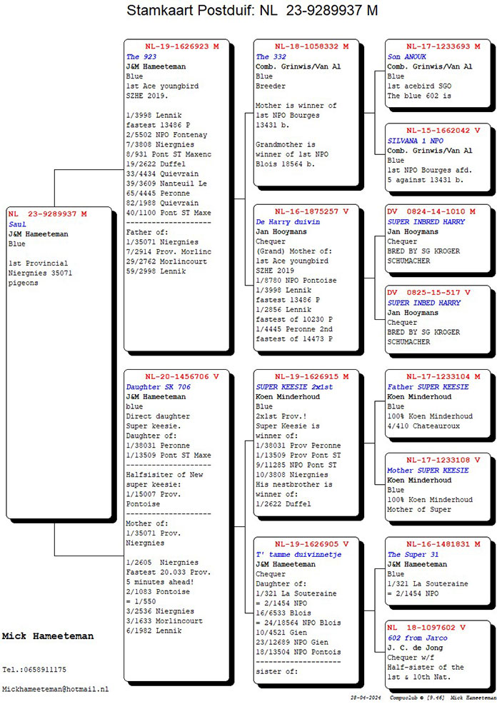 Vader: โโTHE 923โโ, origineel J. & M. Hameeteman. Winnaar van: 1e asduif SZHE jonge duiven, 1e Lennik 13.486 duiven, 2e NPO Fontenay 5.502 duiven, 7e Niergnies 3.808 duiven, 8e Pt.St.Maxence 931 duiven, enzovoort.